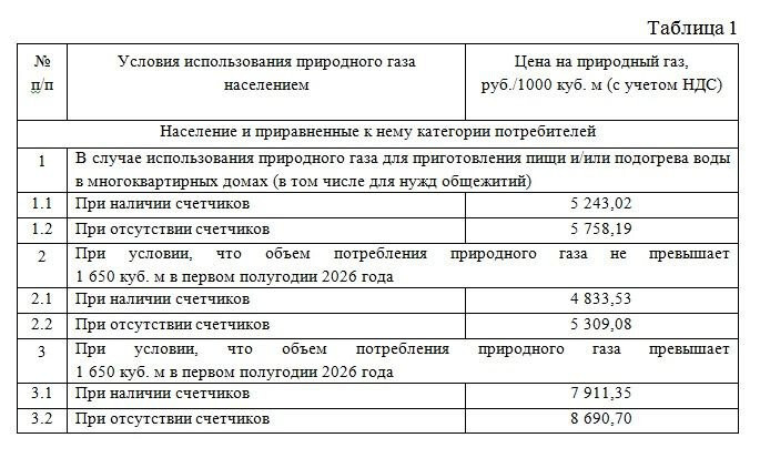 Цены на природный газ с 01.01.2026 по 30.06.2026 приведены в Таблице 1